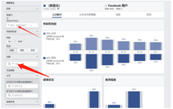 Facebook用户的年龄一般在25-54岁之间,默认性别选项为“无限制”,可根据自己情况进行修改。