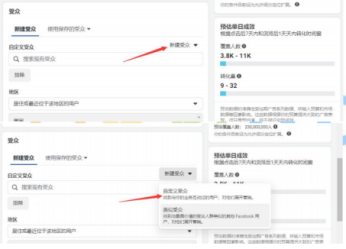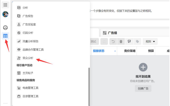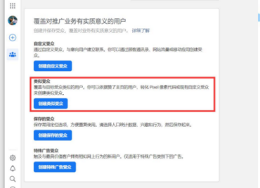 打开广告管理器,点击左侧“广告组”会出现“受众群体”,点击新建受众。