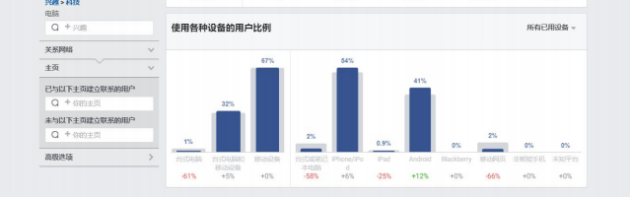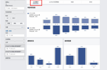 人口统计:较深的蓝色条代表商家选择的受众,旁边的浅灰色条代表全球 Facebook受众,可以与所有用户相比,了解受众在平均值上方还是下方。
