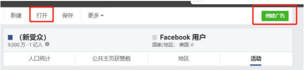 如果Audience Insights创建的受众人数超过1000,就可以用它作为广告受众,点击“打开”选择要定位的受众群体,然后进行广告创建。