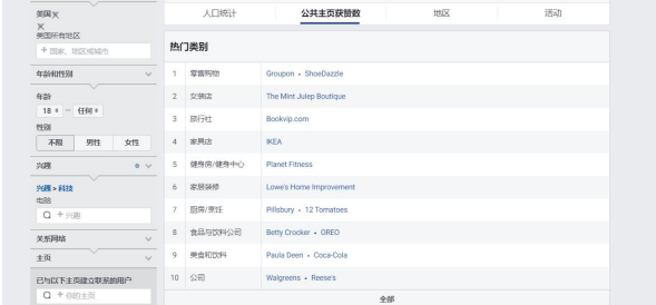 主页赞:根据所选受众喜欢的主页显示最相关的主页和类别,后期可以根据她们的喜好来建立相应的广告素材。