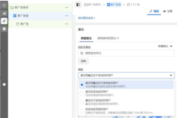 首先要确定广告的地理位置并限制受众范围,可使用地图或者输入地区名称来设置,如果想吸引最多受众,可使用默认选项“该地区的所有用户”。