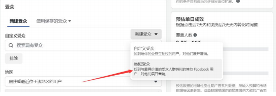 与自定义受众一样,类似受众也可以在创建广告之后,通过广告组操作。