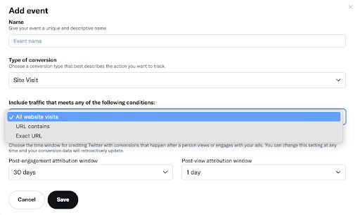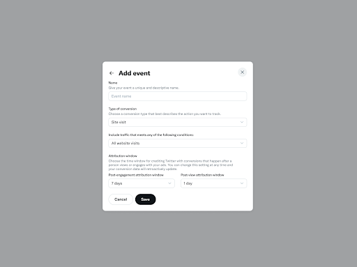 互动后归因窗口:选择在有人与你的广告互动后由 Twitter 计入转化数据的时间窗口。互动量示例包括喜欢次数、转推次数、关注次数、回复次数或 URL 点击量。