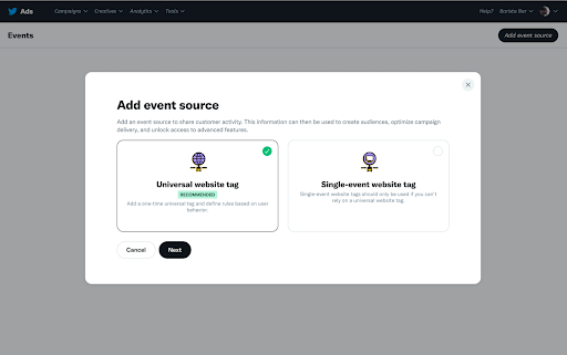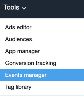 要进行此项操作:a)在 http://ads.twitter.com 上登录你的广告账号b)选择“工具”菜单中的“事件管理器”