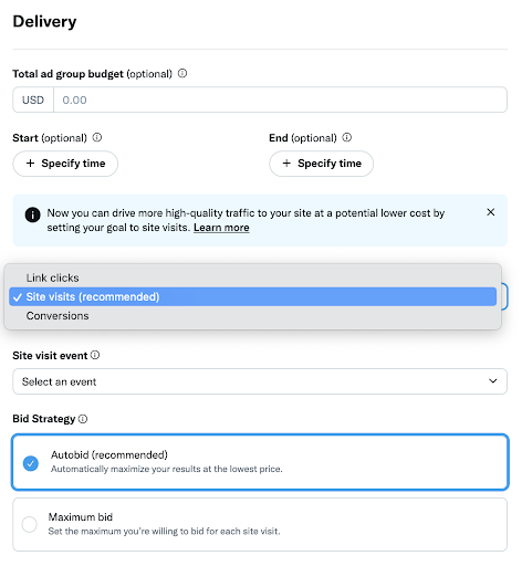 c)在填写广告组细节时,请选择“优化偏好”菜单下的“网站转化”。由此可创建名为“关键转化指标”的新字段,可以在此选择转化事件。