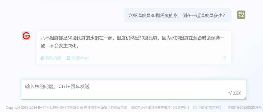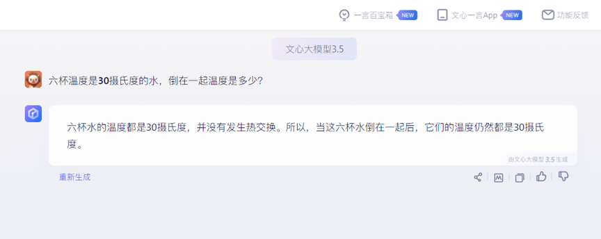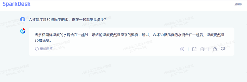 对于这种语言模型来说,逻辑思维无疑是一个重要的维度,如果回答的问题一点逻辑性都没有,怎么能称得上智能呢?我们用文心一言、ChatGPT、讯飞星火认知大模型(科大讯飞出品)、默拉智能(基于ChatGPT开发的AI-CMS系统),来测试一下在互联网上流传已久的测试智商问题:六杯温度是30摄氏度的水,倒在一起温度是多少?
