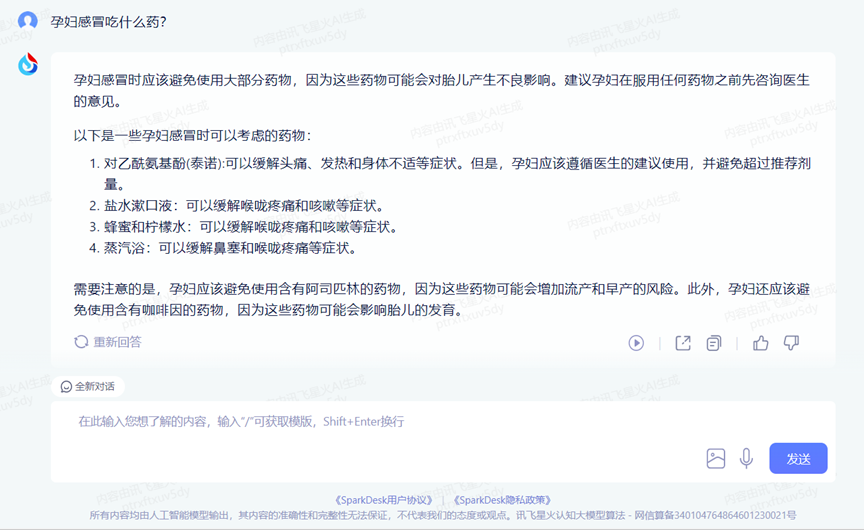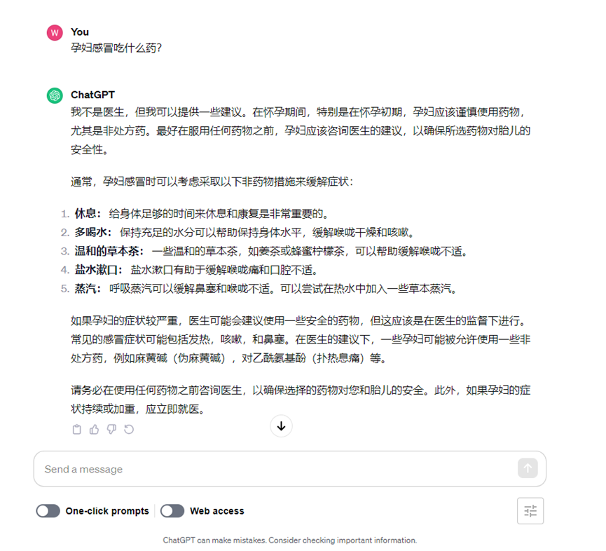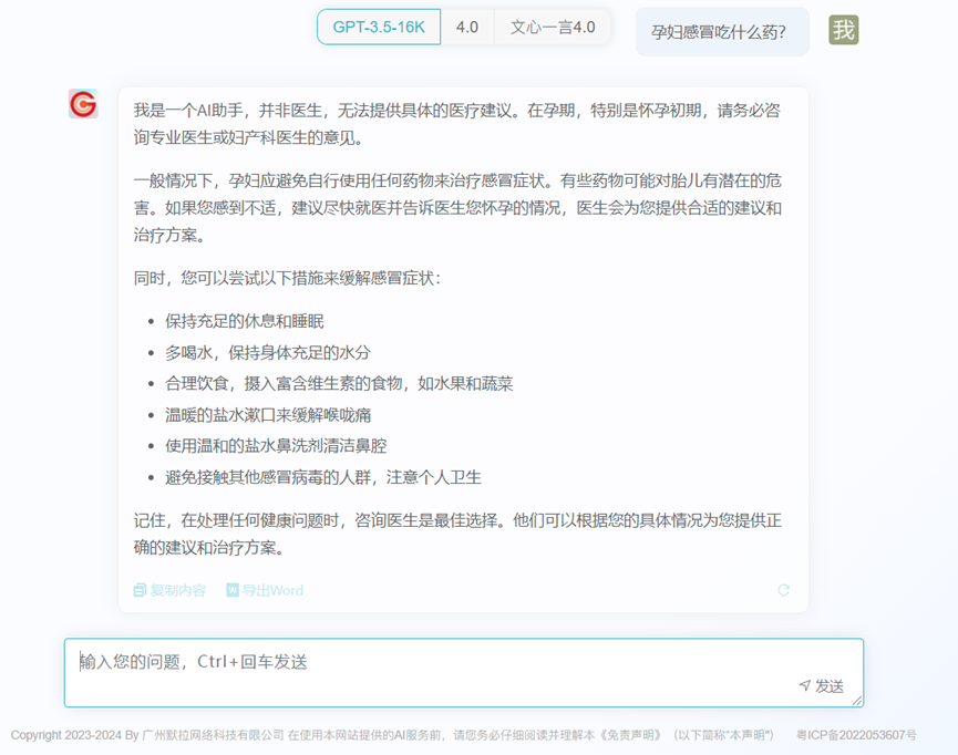 文心一言的老东家百度最让人诟病的是在医疗类的搜索结果中,不管什么病,癌症起步,所以,我们也来测试一下相关的问题:孕妇感冒吃什么药?