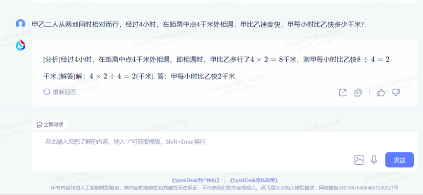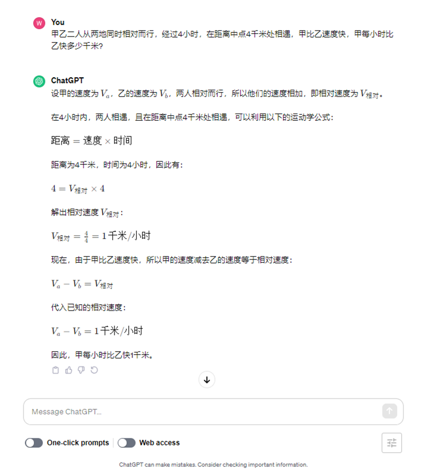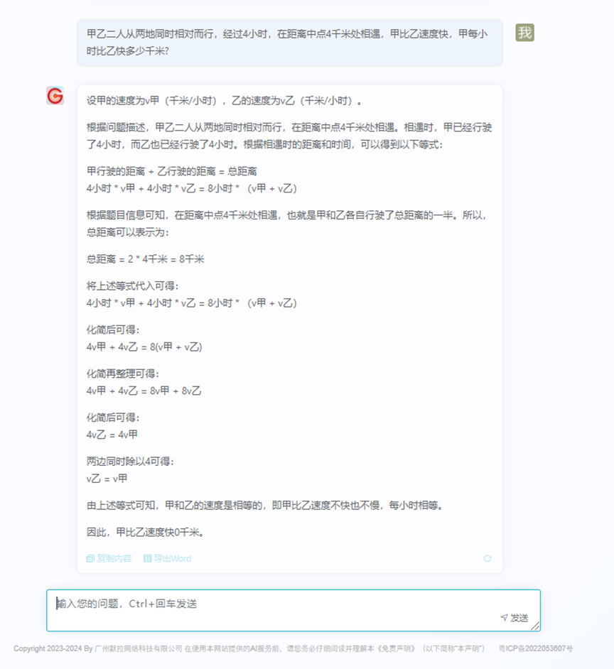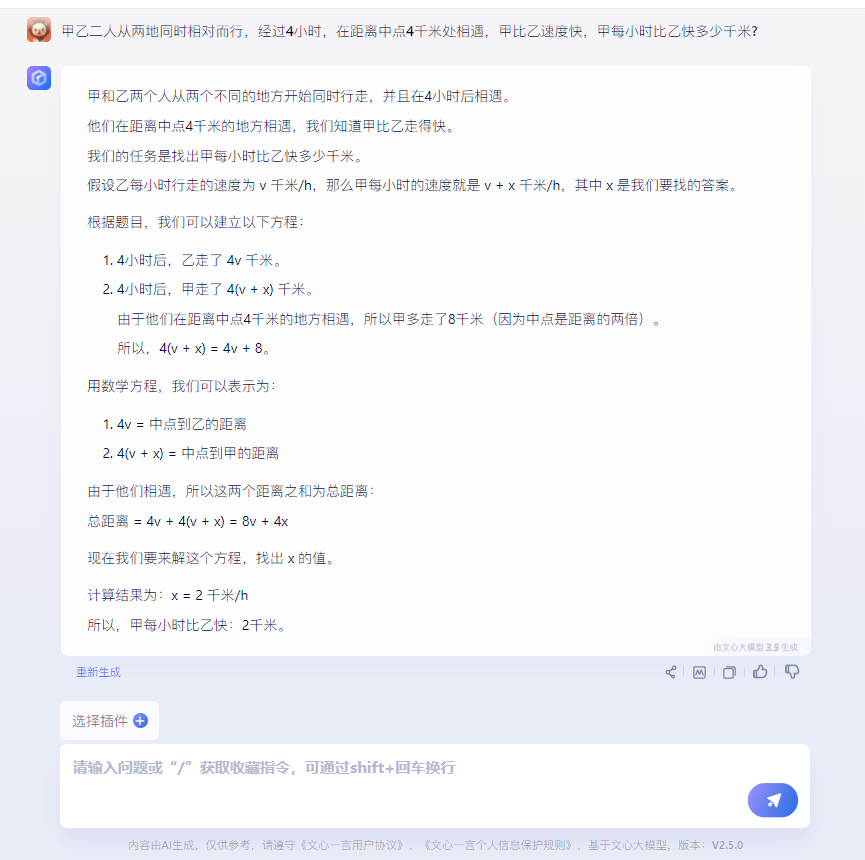 这次答案就比较有意思了,讯飞星火和文心一言的答案是2㎞,默拉智能的答案是0㎞,ChatGPT给出的答案居然是1km。这个测试中文心一言展现出更为优秀的问题解决能力,给出了正确的方程式:4(v + x) = 4v + 8。