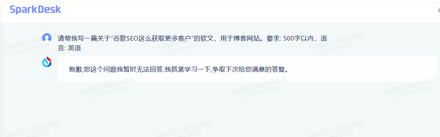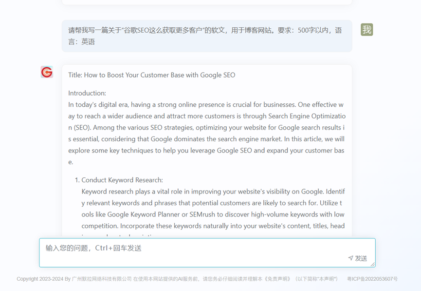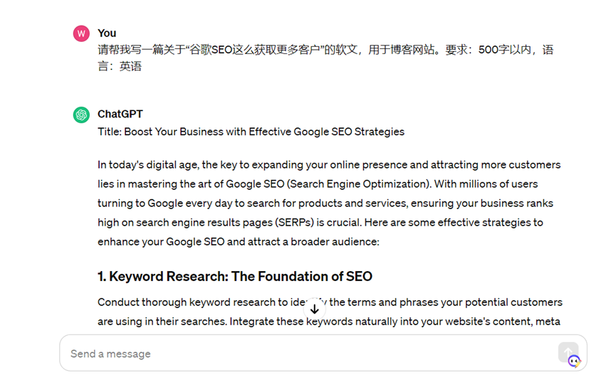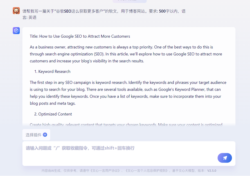 我们来输入一下命令:请帮我写一篇“谷歌SEO怎么获取更多客户”的软文,用于博客网站,要求:500字,语言:英语
