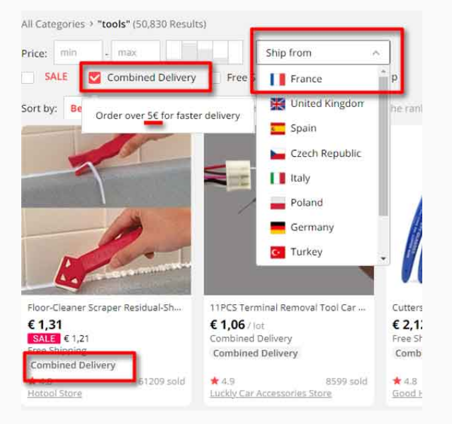 2.通过使用“组合交付”复选框,您可以优化您的搜索结果。订购价值超过5美元的产品,以便更快交货。