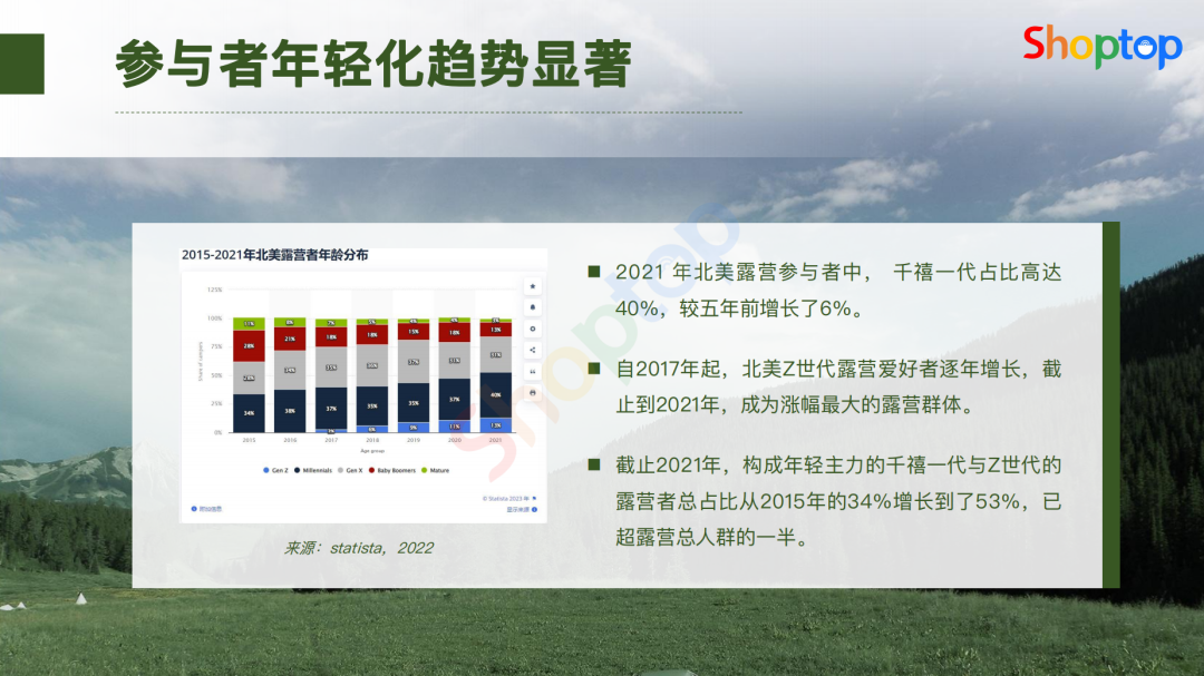 2021年北美露营参与者中,千禧一代占比高达40%,较五年前增长了6%。自2017年起,北美Z世代露营爱好者逐年增长,截止到2021年,成为涨幅最大的露营群体。截止2021年,构成年轻主力的千禧一代与Z世代的露营者总占比从2015年的34%增长到了53%,已超露营总人群的一半。
