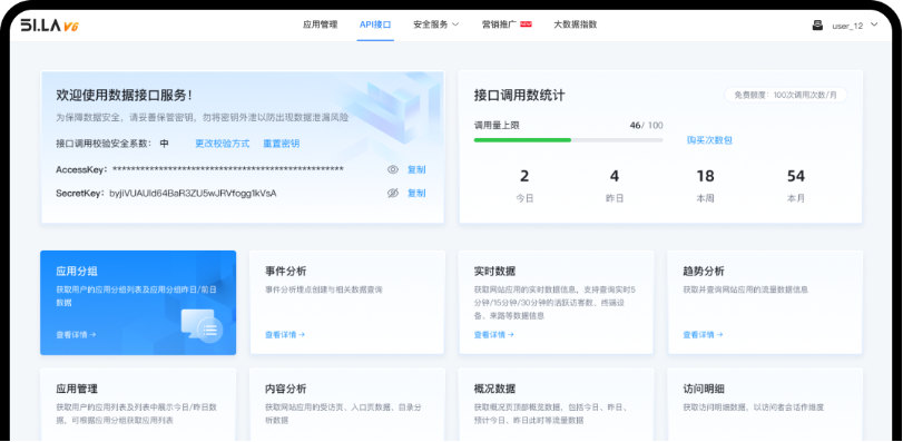 全量数据 API 接口:方便将统计数据二次开发、集成到企业内部系统,输出数据报表看板。