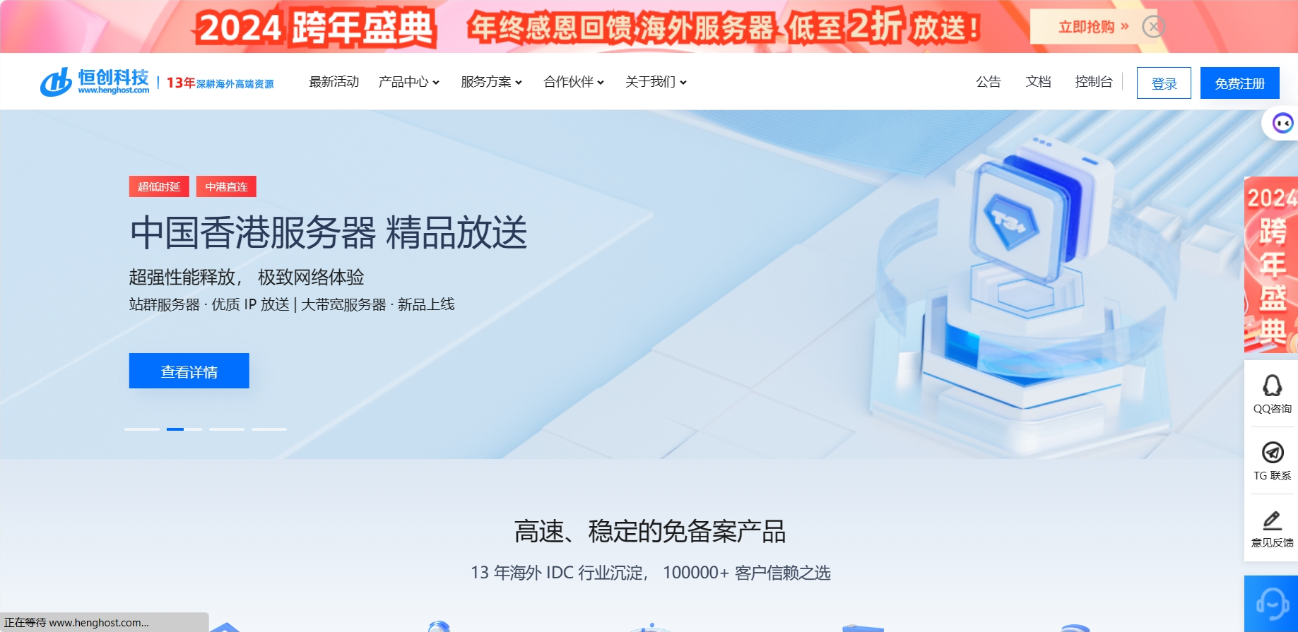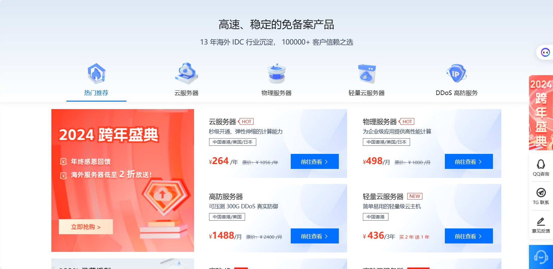 立足香港,辐射全球,13 年深耕海外 IDC 高端资源,高速、稳定的免备案产品,以中国香港、美国、韩国和日本为中心,基于 10+ 顶级 ISP 构建高速冗余网络,主要服务包括热门推荐、云服务器、物理服务器、轻量云服务器、DDoS 高防服务等。