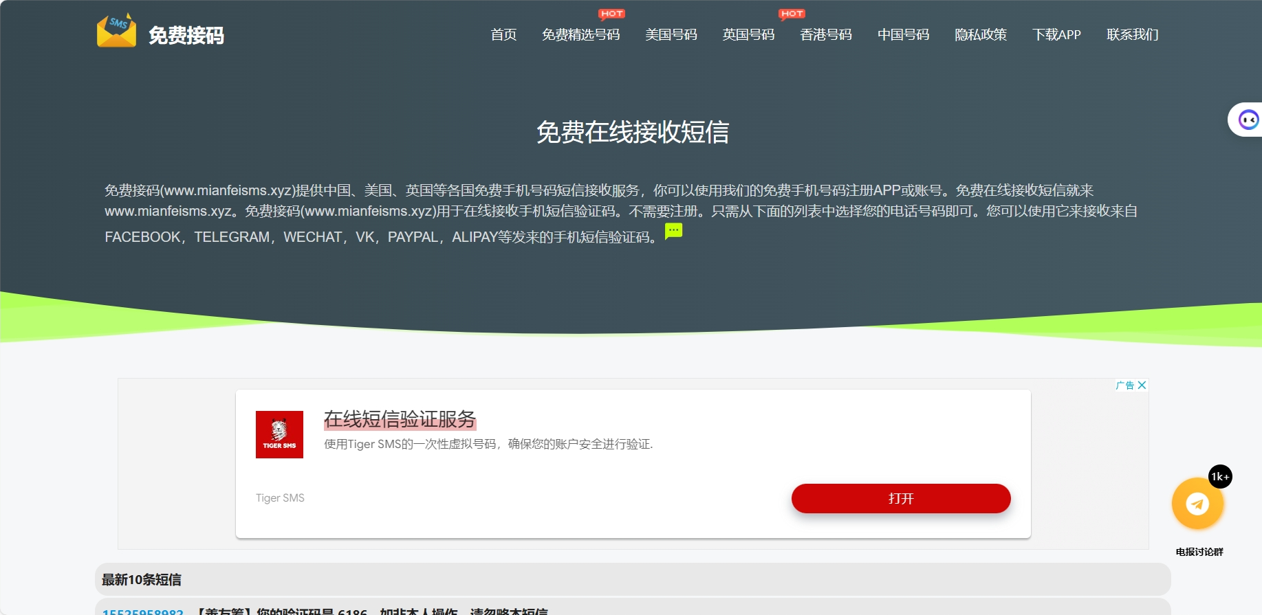 免费接码(www.mianfeisms.xyz)提供中国、美国、英国等各国免费手机号码短信接收服务,你可以使用我们的免费手机号码注册APP或账号。免费在线接收短信就来www.mianfeisms.xyz。免费接码(www.mianfeisms.xyz)用于在线接收手机短信验证码。不需要注册。只需从下面的列表中选择您的电话号码即可。您可以使用它来接收来自FACEBOOK,TELEGRAM,WECHAT,VK,PAYPAL,ALIPAY等发来的手机短信验证码。
