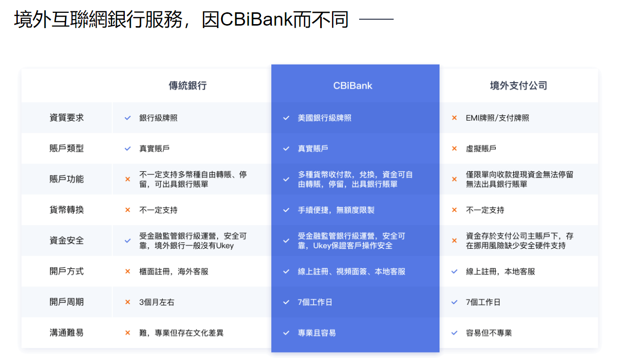 CBiBank拥有稳健合规的经营理念,深刻理解中小企业与新中产阶级面临的不确定性,为此我们提供更加用户友好的产品与服务,CBiBank始终是客户的全球化的伙伴和可信赖的银行。