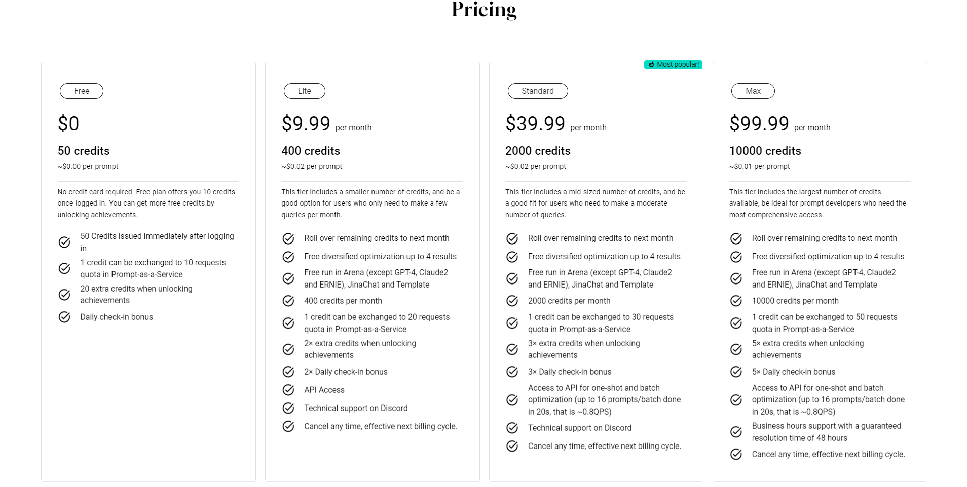 PromptPerfect 提供免费计划,无需信用卡,登录后,免费计划赠送 10 个积分,您还能通过解锁成就获得更多免费积分。50 积分将在登录后立即发放,每个积分可兑换 10 个服务中的请求配额。此外,解锁成就时可额外获得 20 积分,还有每日签到奖励。PromptPerfect 还提供三种付费计划,满足不同用户的需求,包括:精简版、标准版和完整版。