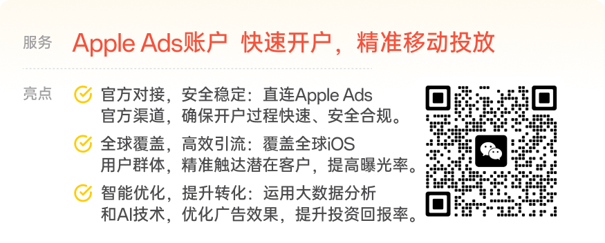 Apple Search Ads是推广iOS应用的重要渠道之一,能够帮助您提升应用的曝光和下载量。