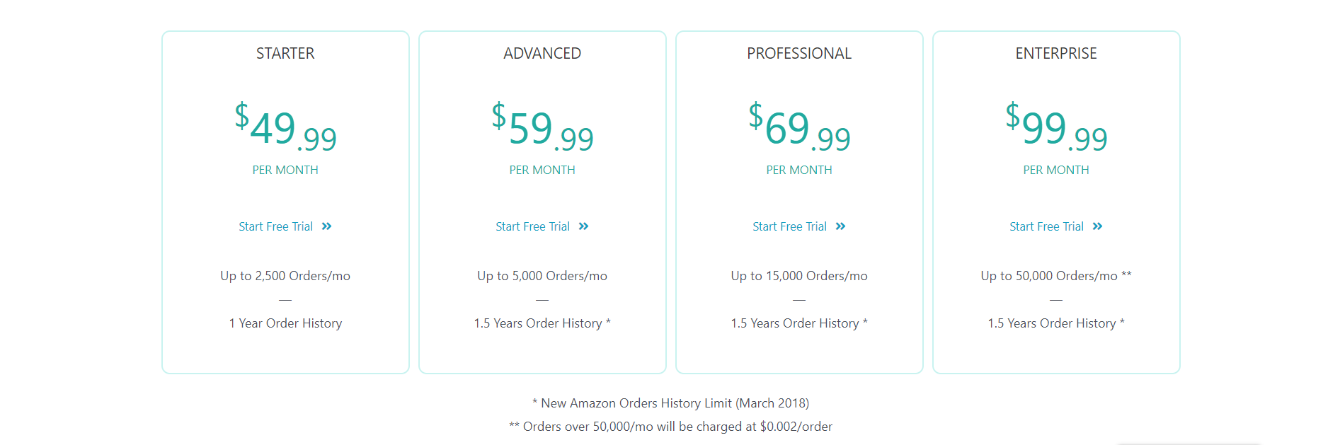SellerLegend 提供简单明了的定价选项,无隐藏费用,确保适用于各类亚马逊卖家,无论是初入亚马逊市场还是经验丰富的大卖家,从私人标签到零售/在线套利,单一或多个亚马逊市场销售,都能找到适合自己的完美 SellerLegend 计划。Starter 计划每月 $49.99,支持最多 2,500 个订单;Advanced 计划每月 $59.99,支持最多 5,000 个订单;Professional 计划每月 $69.99,支持最多 15,000 个订单;Enterprise 计划每月 $99.99,支持最多 50,000 个订单,超过 50,000 个订单每月将按每订单 $0.002 的费用额外收费。每个计划均提供免费试用,覆盖订单历史范围为 1.5 年。