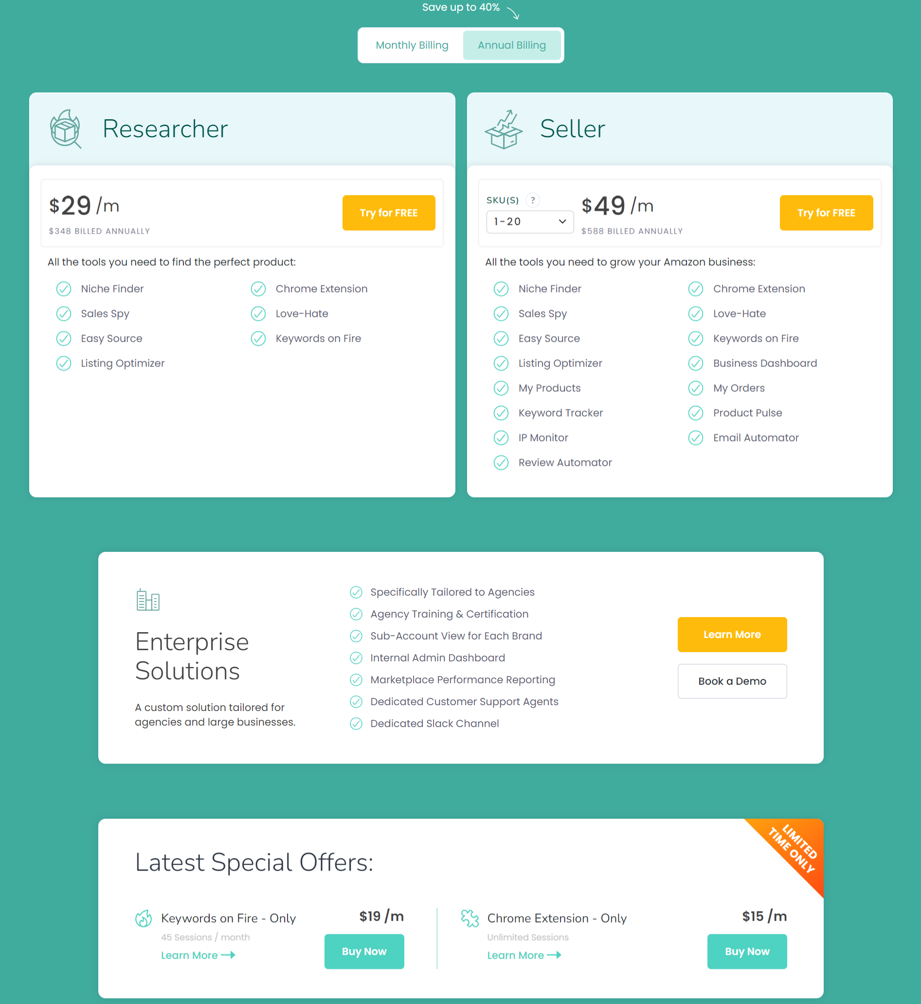 ZonGuru 提供了灵活的价格计划,专为品牌和代理商设计,确保仅面向认真的卖家。用户可以选择每月或年度计费,享受高达 40% 的折扣,并提供 7 天免费试用、轻松取消和退款保证。Researcher 计划适用于寻找完美产品的用户,提供 Niche Finder、Chrome Extension、Sales Spy 等所有必要工具。而 Seller 计划则为用户提供了增长亚马逊业务所需的全部工具,包括 Business Dashboard、My Products、My Orders、Keyword Tracker、Product Pulse、IP Monitor 等。此外,还提供企业解决方案,专为代理商和大型企业量身定制,包括专属培训、品牌的子账号视图、内部管理仪表板等。