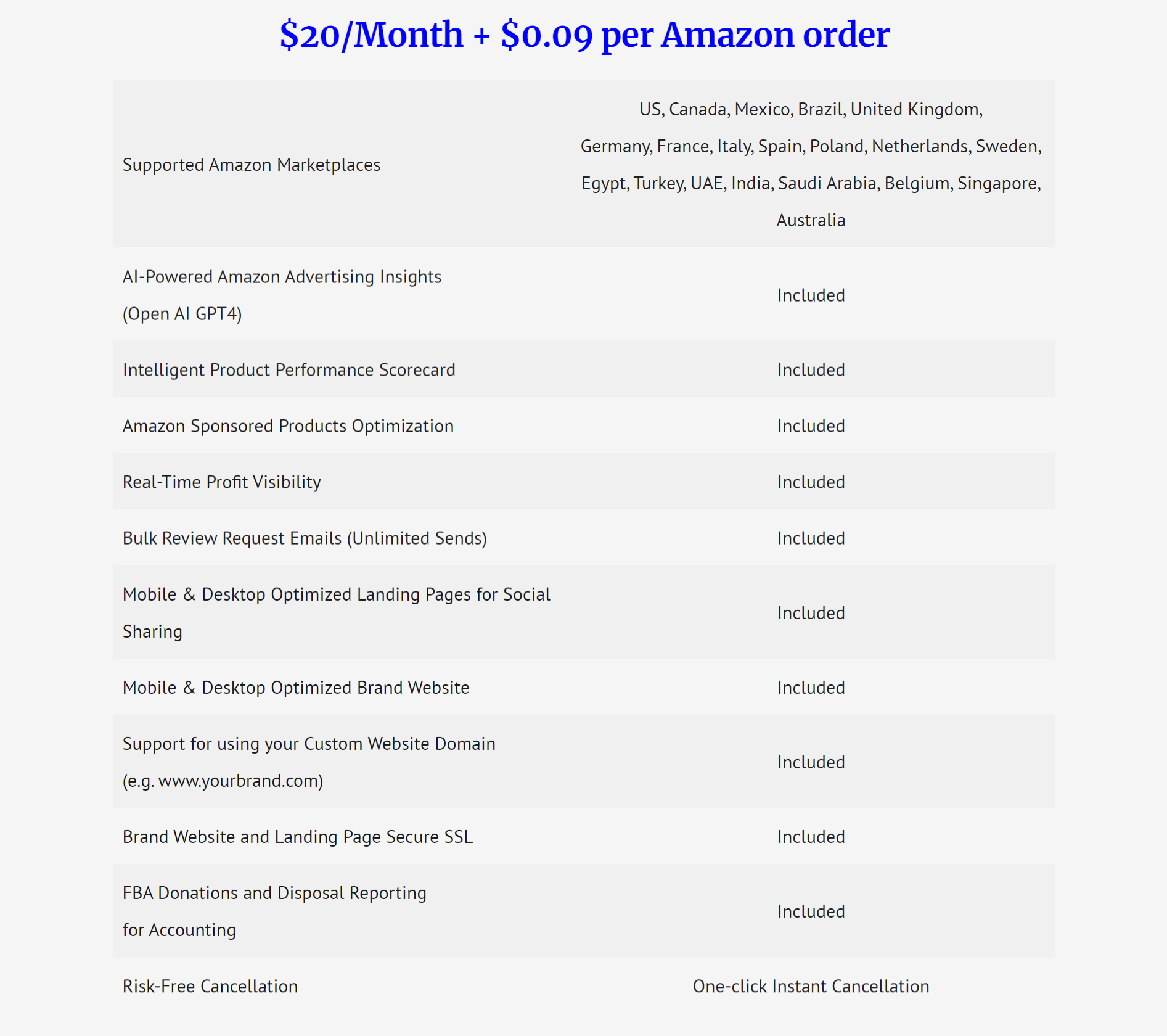 My Seller Pal 提供简单透明的定价方案,每月仅需 $20,加上每个亚马逊订单的 $0.09 的费用。此价格覆盖多个支持的亚马逊市场,包括美国、加拿大、墨西哥、巴西、英国、德国、法国、意大利、西班牙、波兰、荷兰、瑞典、埃及、土耳其、阿联酋、印度、沙特阿拉伯、比利时、新加坡和澳大利亚。My Seller Pal 的定价方案包括 AI 动力的亚马逊广告洞察、智能产品绩效记分卡、亚马逊赞助产品优化、实时利润可见性、批量评价请求电子邮件(无限次发送)、移动和桌面优化的着陆页和品牌网站等一系列功能,提供风险免费的一键即时取消,并提供 30 天免费试用,无需信用卡即可开始使用。