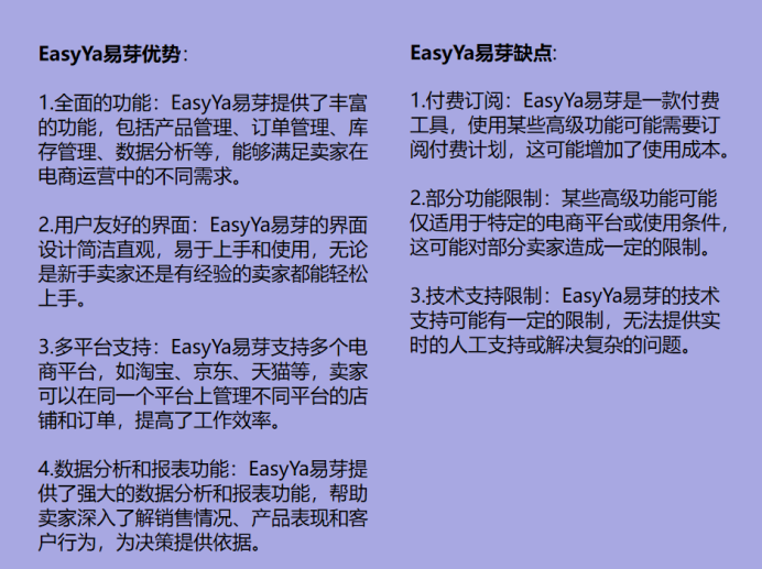 EasyYa易芽提供了产品管理、订单管理、库存管理、数据分析和报表等功能。卖家可以通过EasyYa易芽集中管理产品信息、处理订单、跟踪库存情况,并通过数据分析了解销售情况和客户行为。