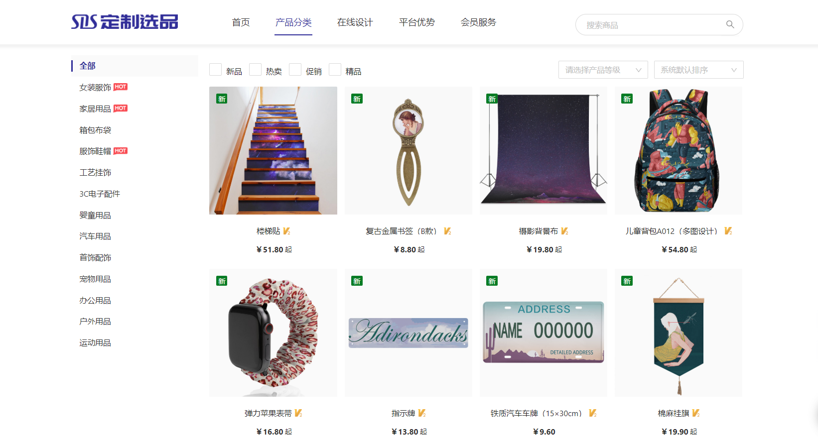 1.进入SDS定制选品官网,点击导航栏中【产品分类】,通过商品类目进行选择产品。