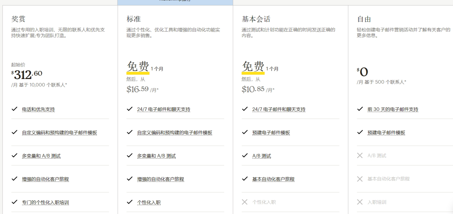 MailChimp设置了多档定价,几乎可以满足您的一切需求。其中付费版第一个月免费,从第二个月开始计费。