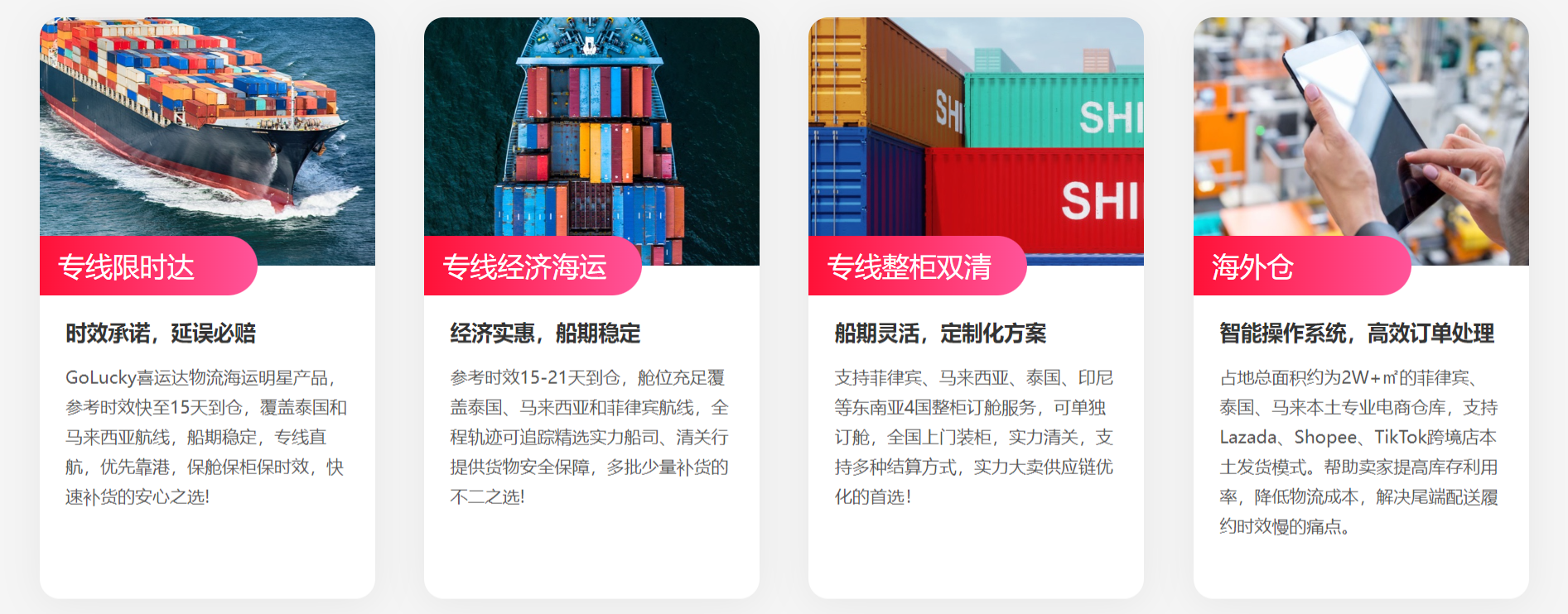 GoLucky 喜运达物流提供多元化的物流服务,包括限时达专线、经济海运、整柜双清服务以及海外仓储解决方案。专注于东南亚航线,承诺快速时效、船期稳定,并提供覆盖泰国、马来西亚、菲律宾等地的全程追踪、安全保障的服务。具备强大的智能操作系统和本地专业仓库,为电商提供本土发货模式,优化库存利用率、降低成本、解决尾端配送瓶颈。 GoLucky 喜运达致力于为客户提供高效可靠的物流方案,让跨境运输更便捷、时效更可控。