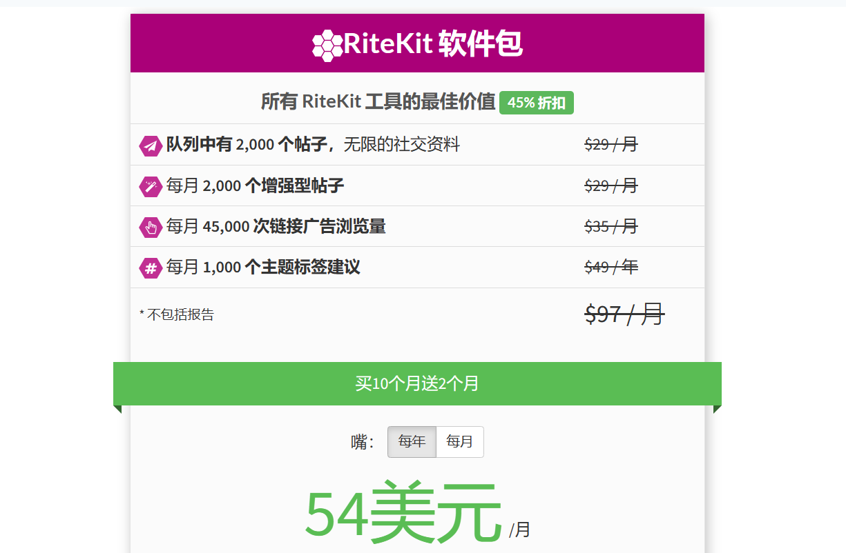 RiteTag的付费定价为49美元/年,包括每月1000次来自浏览器扩展和移动应用程序的查询的主题标签建议。