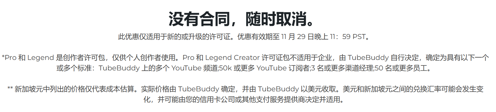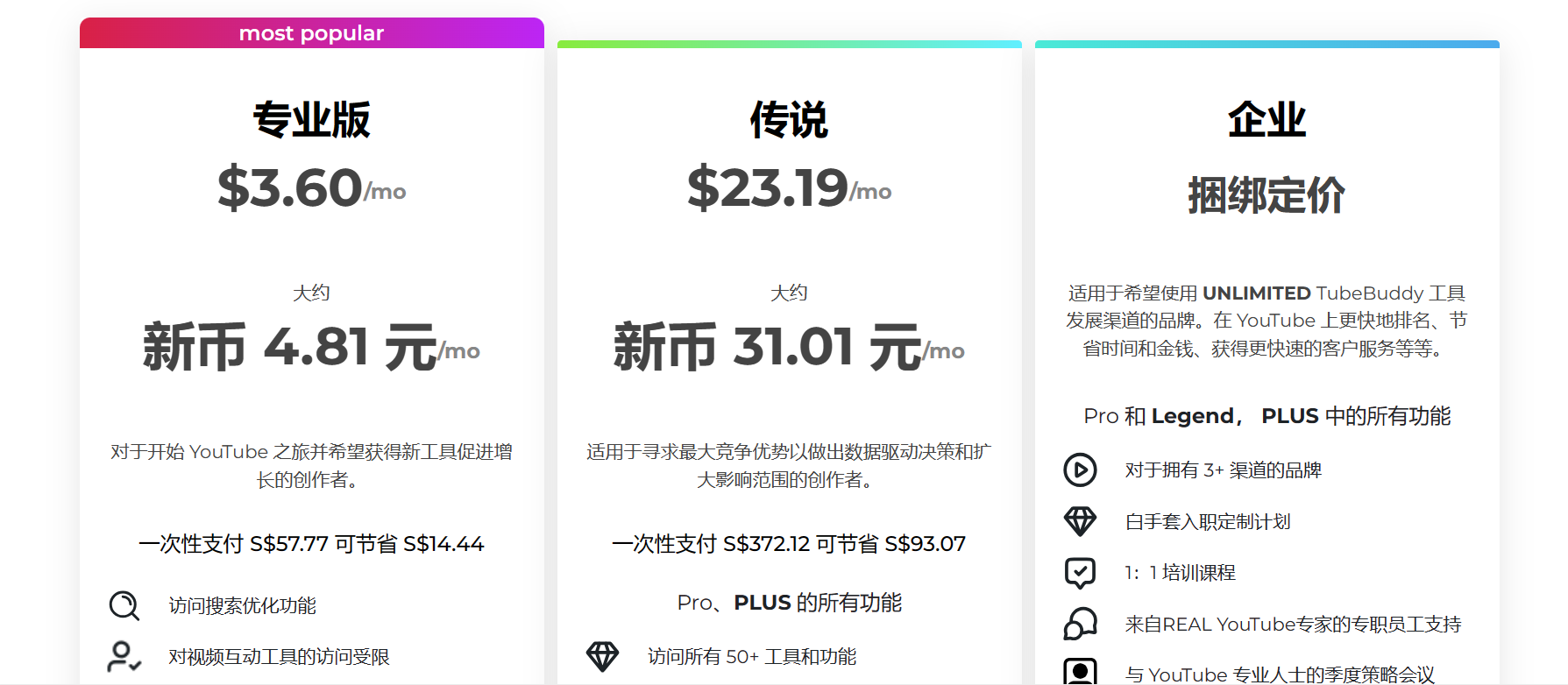 TubeBuddy的付费模式分为月付和年付两种方式,每种方式分为Pro 和 Legend两种套餐,Pro 和 Legend是创作者许可包,仅供个人创作者使用,另外还有企业定制包,需要根据企业需求进行定价,都没有合同,随时取消。具体套餐内容可到官网查询