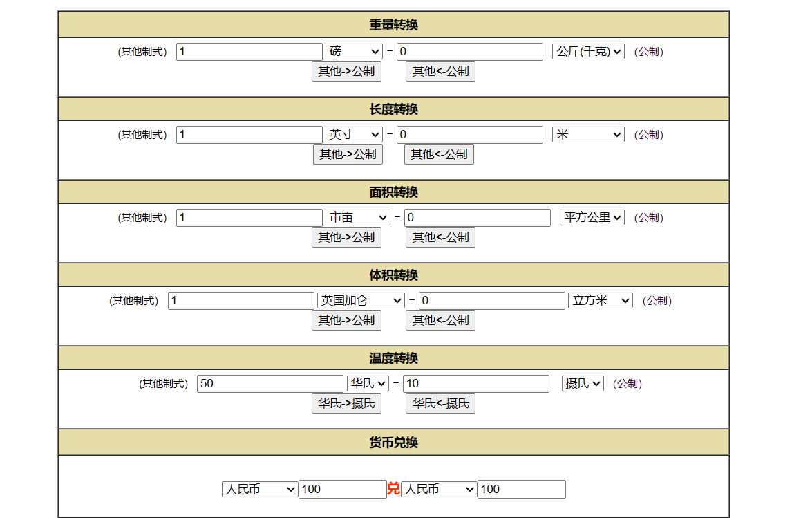 在等式右边文字输入框填入公制计量单位数量,如“1”,在等式右边公制计量单位下拉菜单中选择单位,如“公斤”;在等式左边非标准计量单位下拉菜单中选择单位,如“磅”,点击“公制->其他”按钮,即在等式左边的文字输入框中得到“2.205”磅。
