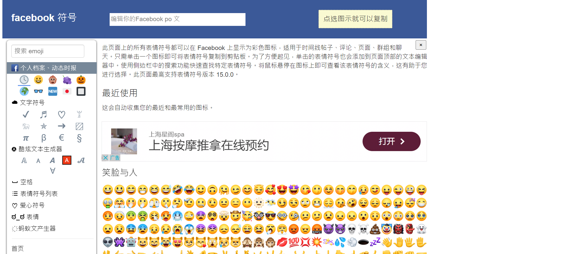 用户可以在这个平台上轻松选择并复制数百个 emoji 表情,同时还提供列表符号、颜文字、蚂蚁文以及其他特殊符号。这些表情符号均可在 Facebook 上显示为彩色图标,适用于时间线帖子、评论、页面、群组和聊天。无需安装应用程序或插件,使用简单便捷。