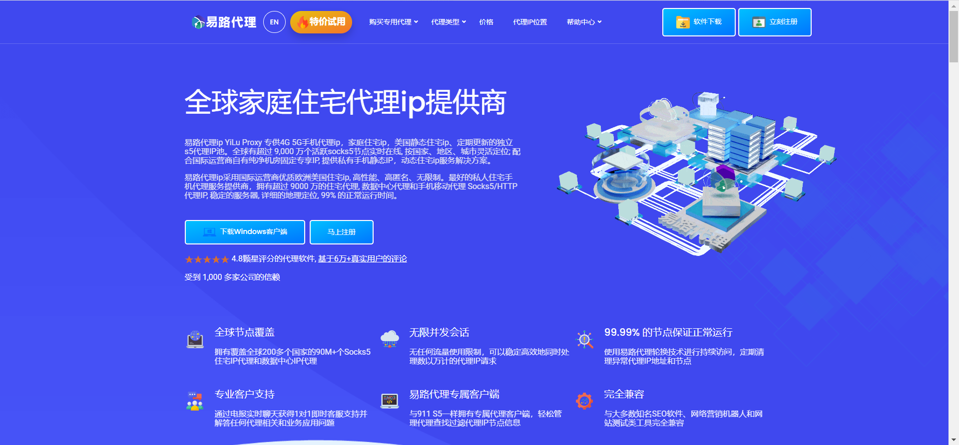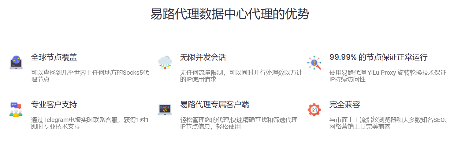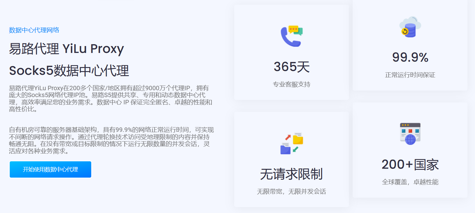 易路代理 YiLu Proxy 提供数据中心代理IP - 拥有覆盖全球200+个国家的数据中心机房代理,支持Socks5/HTTP代理协议, 高性能、高稳定性、高在线率适合需要高速连接,无限带宽和无限并发请求的长时效代理IP的业务需求。