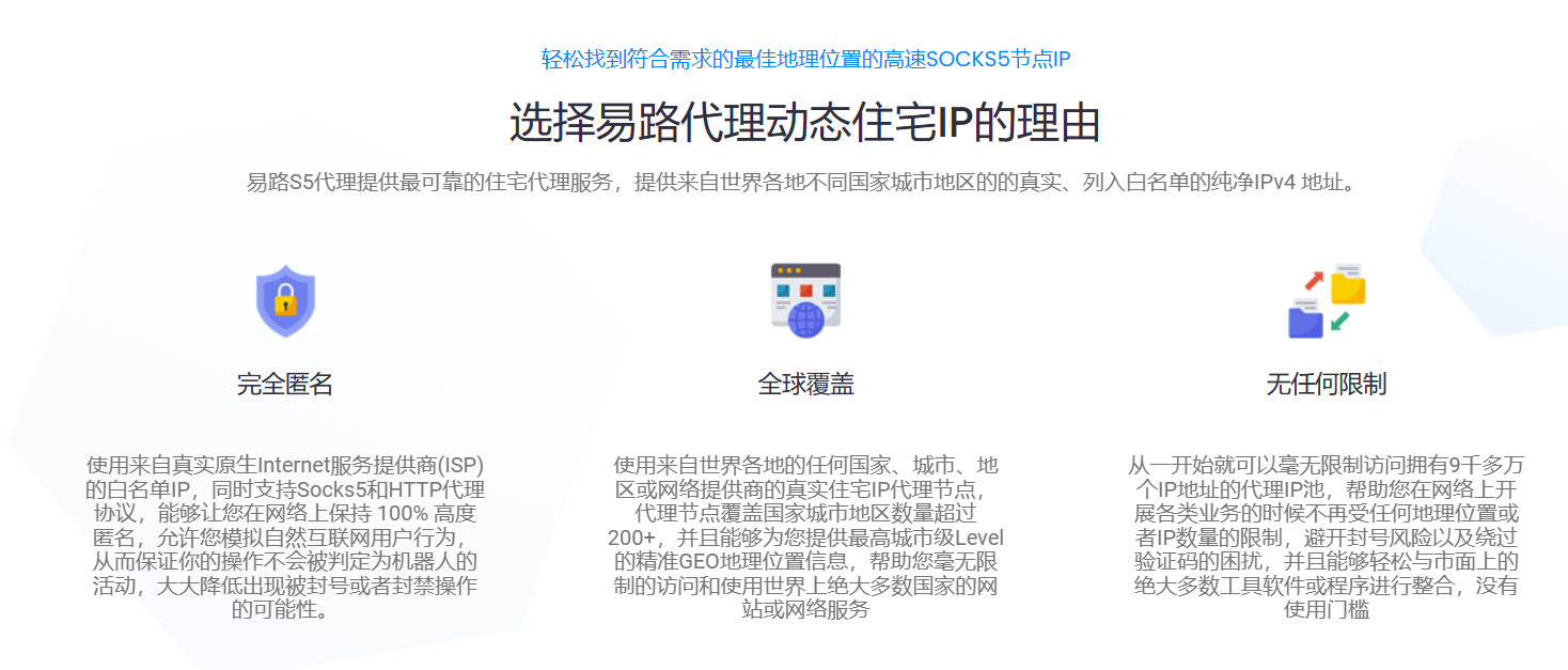 易路代理 YiLu Proxy 提供全球住宅代理IP - 拥有9000万+全球住宅ip组成的代理ip池,支持Socks5/HTTP代理协议, 优质高匿适合企业及个人的各类电商运营,数据采集,SEO监测,社交账户注册,多账户批量管理等业务需求。