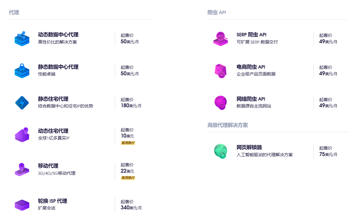 oxylabs设置了多档定价方案,分为爬虫系列和代理系列