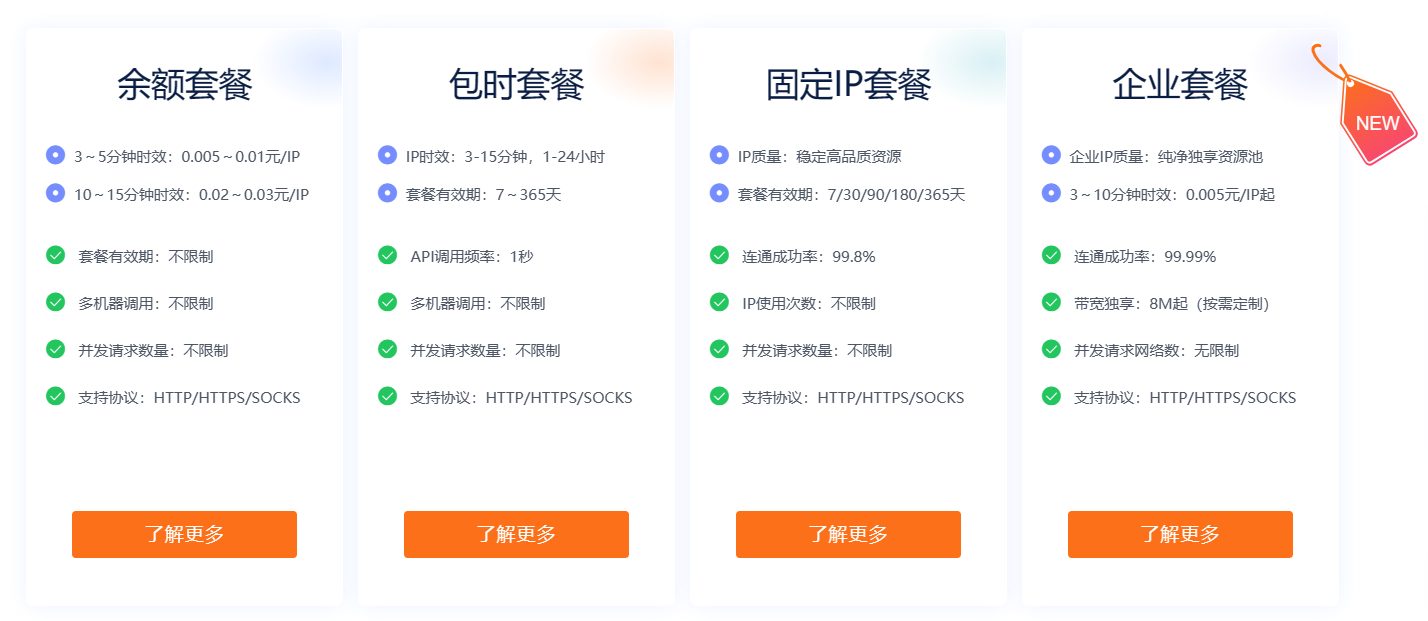 天启HTTP提供多种套餐选择,分为余额套餐、包时套餐、固定IP套餐和企业套餐。