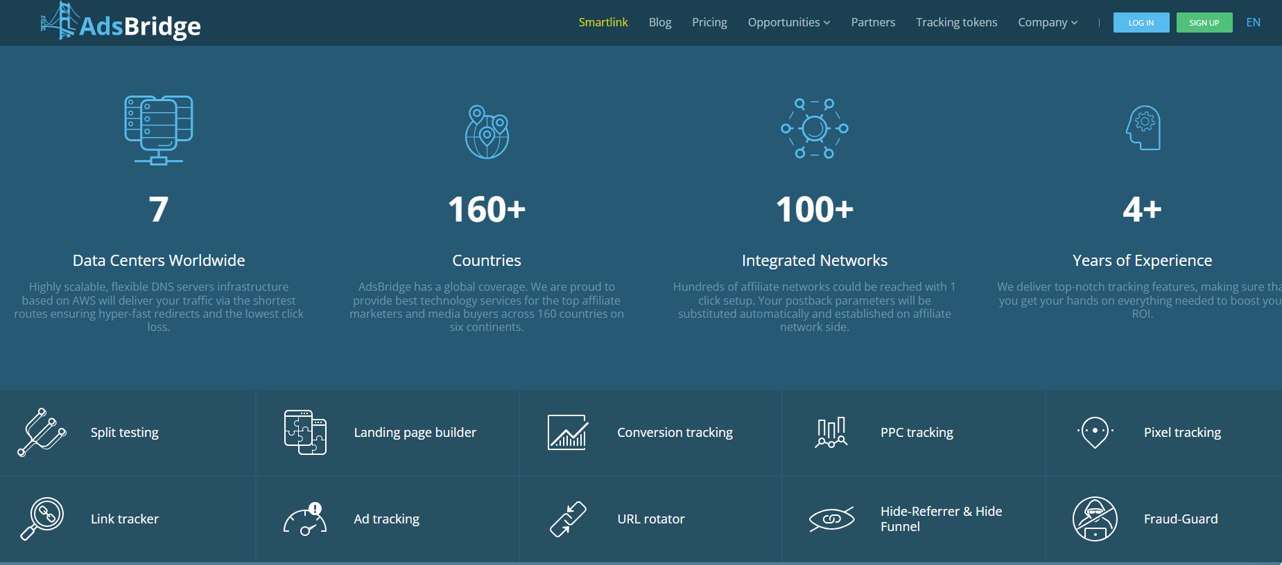 Adsbridge 是一家专业的广告跟踪平台,旨在帮助营销人员和广告商优化其广告活动并提高投资回报率。Adsbridge 提供了强大的跟踪功能,可以跟踪各种广告渠道的数据,包括点击、转化和收入等关键指标。通过这些数据,用户可以深入了解其广告活动的效果,及时调整策略以提升广告效果。