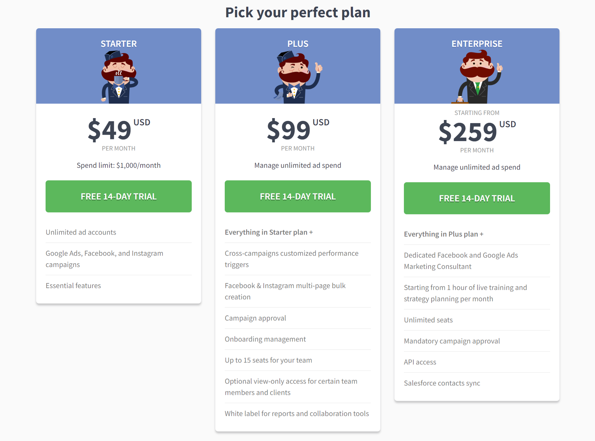 AdEspresso 提供了灵活的定价计划,根据不同的业务需求而定,用户可以在14天内免费试用。Starter 计划每月 49 美元,适合支出限制在每月 1000 美元的小型企业,提供基本功能,并在 Google Ads、Facebook 和 Instagram 广告中提供无限的广告账户。升级至每月 99 美元的 Plus 计划可解锁广泛的功能,包括跨广告系列定制触发器、Facebook 和 Instagram 的多页面批量创建、入职管理和白标签功能,适用于最多 15 个团队成员的大型团队。对于寻求顶级支持的企业来说,起价 259 美元 / 月的企业计划涵盖了 Plus 计划的所有内容,并增加了专属顾问、实时培训会议、API 访问权限、Salesforce 联系人同步和无限的团队席位。