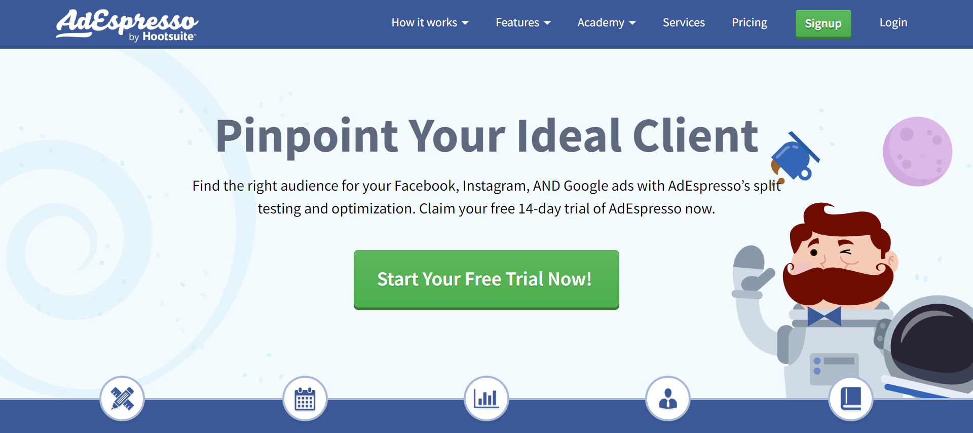 AdEspresso 适用于广泛的用户群体,主要面向小型和中型企业,旨在简化并优化其 Facebook 和 Google 广告活动。