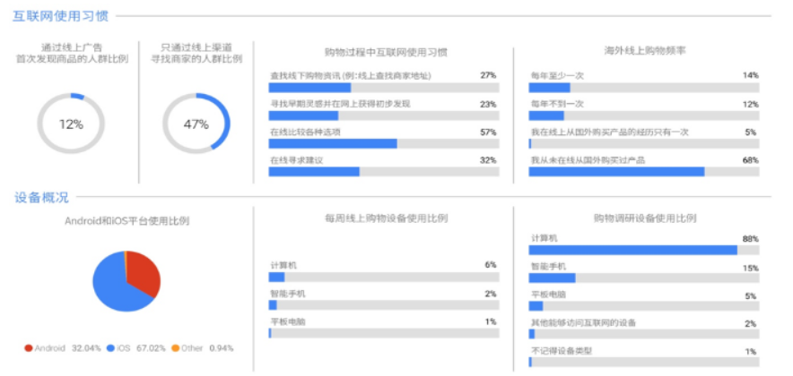互联网购物习惯:在互联网上,你能看到客户寻找信息的渠道、海外购物频率等。如果你要进军当地市场,就要对症下药,客户在网上搜索信息,那他们搜索的时候你一定要出现。大家购物时使用计算机占比较大,那你营销要更多瞄准电脑端。