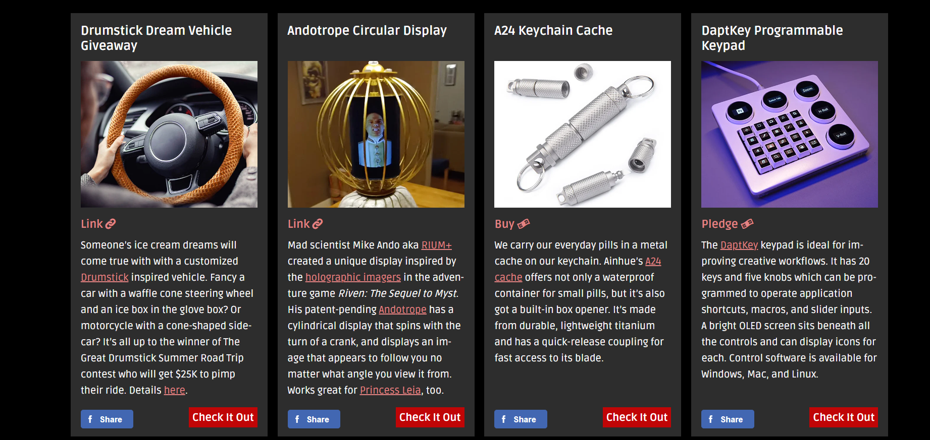 我们已发布超过 50,000 个故事。我们已与 Gizmodo、Boing Boing、PC Magazine、Geekologie、Laughing Squid、Neatorama、NotCot、SlashGear、Ubergizmo、Geeky Gadgets、The PreSurfer 等网站建立了联系。