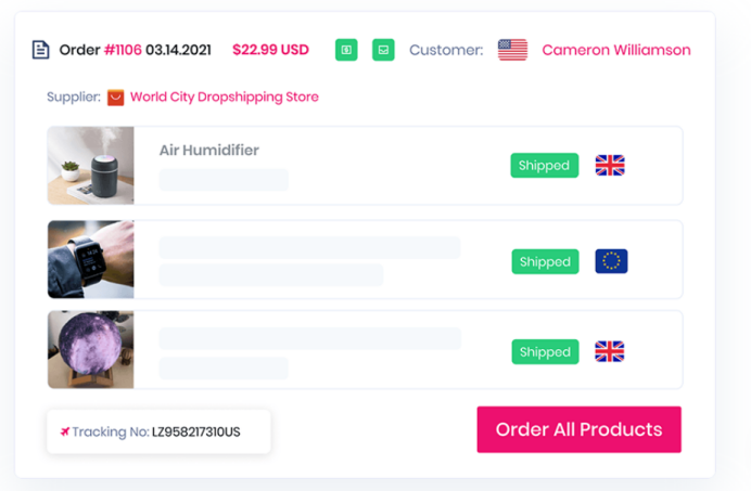 自动将您的库存与供应商的可用库存同步,一键完成订单,并将完整的运输和跟踪信息直接发送给您的客户,以获得无缝体验。