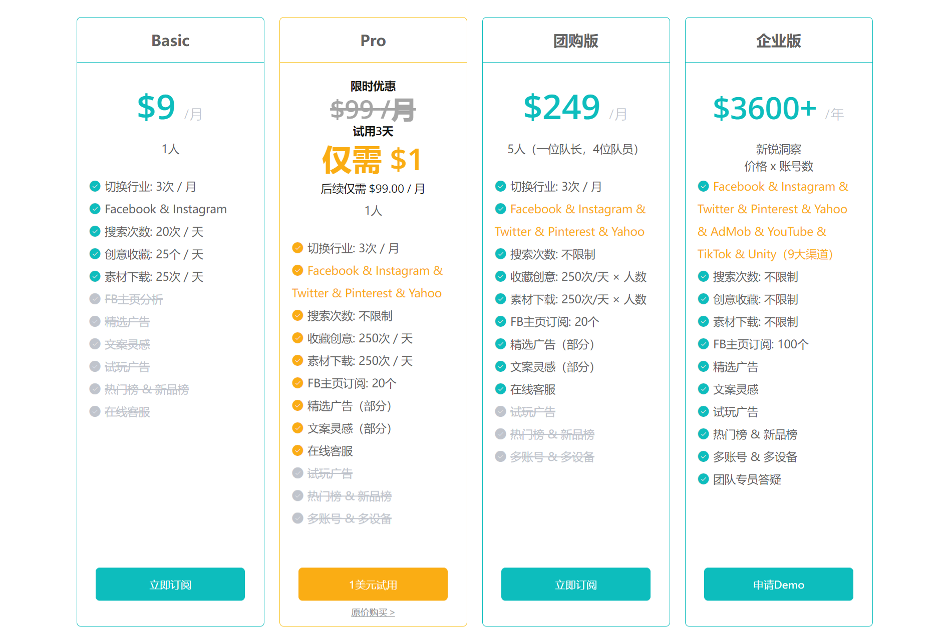 BigSpy 提供了多种订阅选项,适合不同需求和预算。基础套餐每月 $9,提供了基本的功能和限制,适用于个人用户。专业版针对更高级的需求,在限时优惠下,首月仅需 $1,随后每月 $99。团购版则针对团队使用,月费 $249,提供更多的人员配额和功能限制。而企业版则提供了更全面的功能和服务,包含了更多广告渠道,灵活的定价,适用于大型企业或有特殊需求的专业人员。同时,这些订阅都是自动续费,用户可以根据需要选择不同的订阅方案。