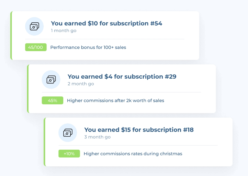 Tapfiliate 在佣金方面非常灵活。以恰到好处的奖励吸引您的会员、推荐合作伙伴和影响者。