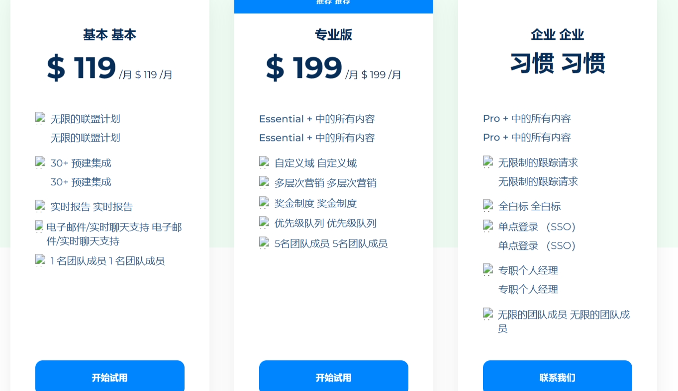 基础版:包含无限的联盟计划、30+ 预建集成、实时报告、电子邮件/实时聊天支持等基础功能。