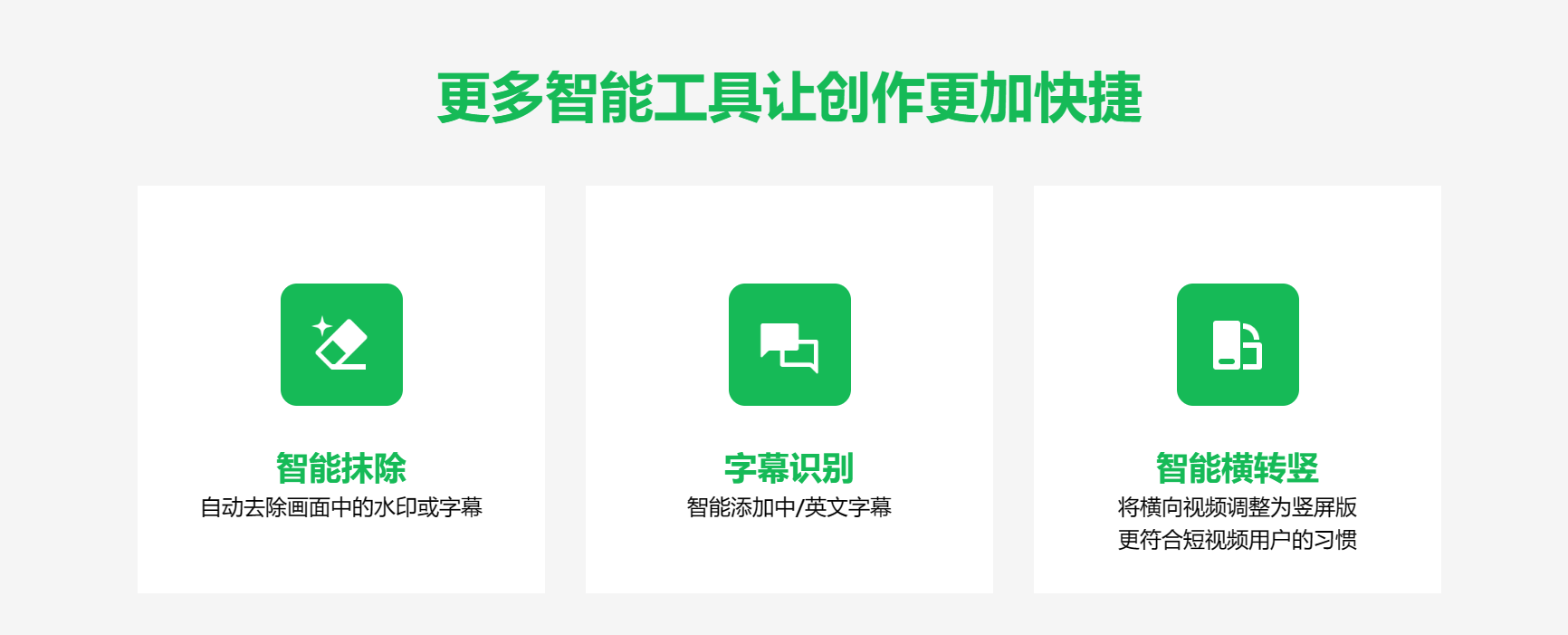 作为一款智能视频创作工具,智影结合强大的AI创作能力,提供包括视频剪辑、素材库、文本配音、数字人播报、字幕识别、文章转视频、智能去水印、智能横屏转竖屏等功能,帮助用户更好地进行视频化的表达。