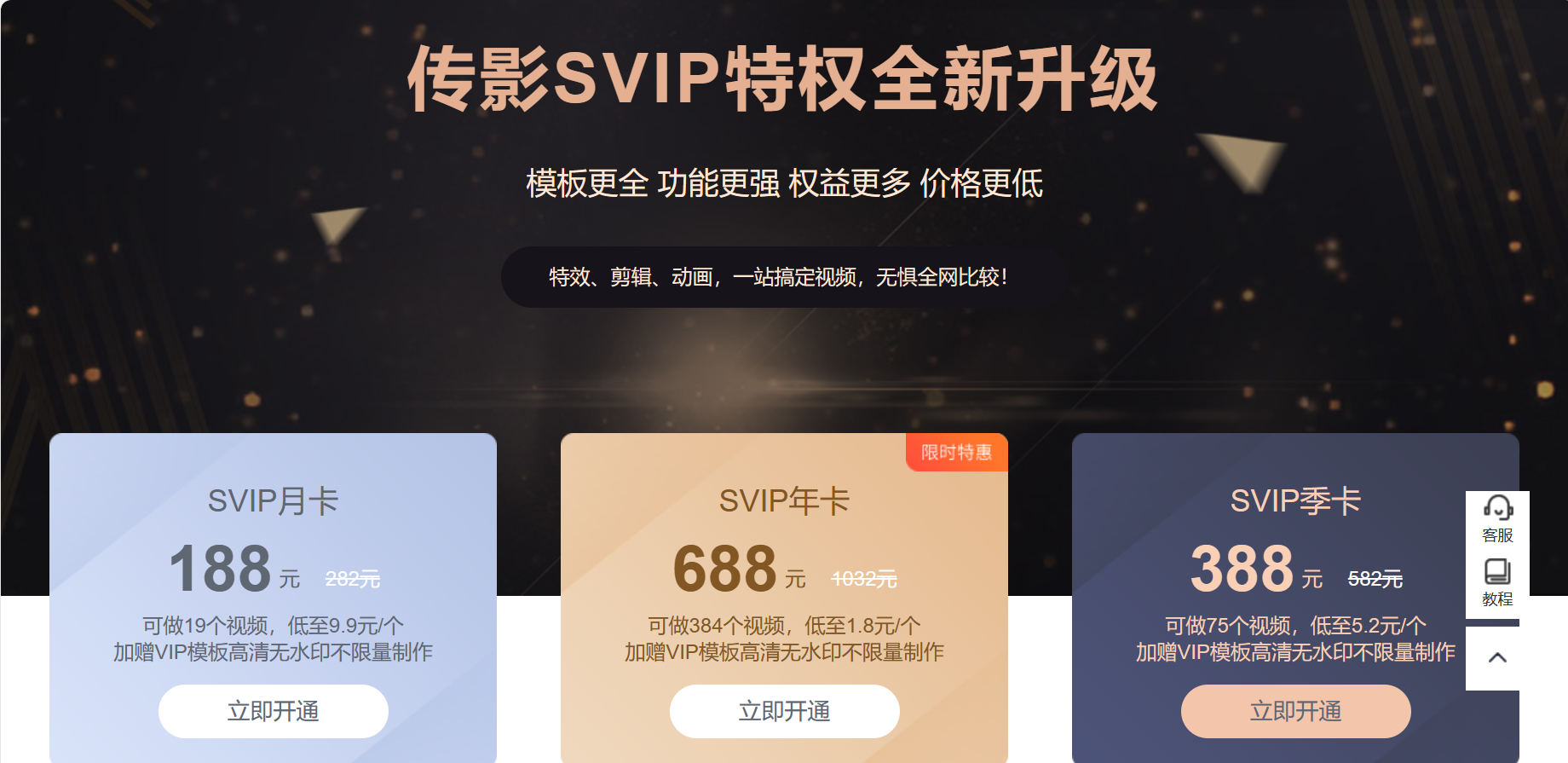 轻剪辑采用会员制的付费模式,按照月卡,季卡,年卡三种套餐,每种所享受的功能数量不一样。具体套餐对比可到官网查询