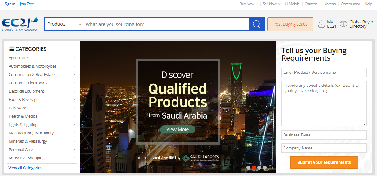 EC21目前有3个站点,其中包括EC21中国站、EC21韩国站和EC21全球站,支持8种不同的语言。类似于阿里巴巴国际站,EC21提供基础和高级会员服务,卖家可以轻松创建自己的主页、展示产品、回复报价请求并与买家联系。