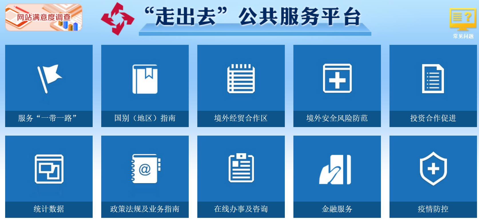 “走出去”公共服务平台是一个官方鼓励企业开拓海外市场的综合性服务平台。该平台在中国商务部原有的“对外投资和经济合作”网站的基础上建立,整合了外交部、国家税务总局、国家外汇管理局等多个部门的政策内容,并增加了关于“一带一路”建设、国际产能合作等资讯模块。
